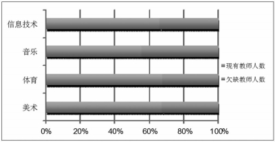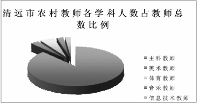 一方面,由于近年农村人口出生率下降以及适龄儿童随父母外出务工,农村学生人数逐年减少,2005年以来农村学生总数减少了约60%,因而导致农村中小学专任教师特别是小学专任教师总体上超编。由于农村学校规模小、教学点分散,要保留小班额教学,甚至要实行复式班教学,因而教师总量仍然是不足、师资配置不齐,出现了教师包班教学现象,不利于学生身心健康发展。另一方面,学科教师缺编较严重,农村中小学的英语、计算机、音乐、美术、体育等学科教师紧缺,影响了教育质量的提高,具体见表1、图1。