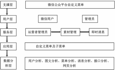 笔者结合公共艺术教育的特点和微信公众平台的开放性,将公共艺术教育微信公众平台的组织结构大致分为了五个层次(如图2微信公众平台组织结构图)。第一,支撑层。支撑是基于微信客户端、微信公众平台,通过对“自定义菜单”创建,能将公众号内容划分为几个模块。第二,用户层。用户层分为微信用户和公众号管理,由管理员(教师)管理平台用户的信息。第三层,服务层。顾名思义,服务层是微信公众号为用户提供的服务,主要由运营者管理员(教师或学生骨干)负责,包括素材库资源推送模块、讨论交流模块、学习评价模块等。第四层,应用层。应用层是面向用户(学生),用户端显示的菜单及子菜单,通过这些菜单提供的功能为学生学习服务。第五层,数据分析层。数据分析层是对公众平台的数据进行分析,探求潜在的规律,由用户分析、图文分析、菜单分析、消息分析、接口分析、网页分析等构成,从数据层获得的数据经过分析可用于改善教学设计和推送内容。