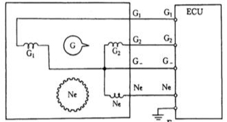 当发动机工作时,ECU根据接收到的曲轴位置传感器(G28)、凸轮轴位置传感器(G40)的信号输入,判断气缸位置,基中曲轴位置传感器G28可输出Ne、一缸和四缸上止点位置信号,凸轮轴位置传感器G40可发出一缸和四缸压缩上止点位置信号,确定初始点火时间,初始点火提前角为10度左右。根据曲轴位置传感器的发动机转速和节气门位置传感器