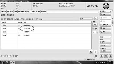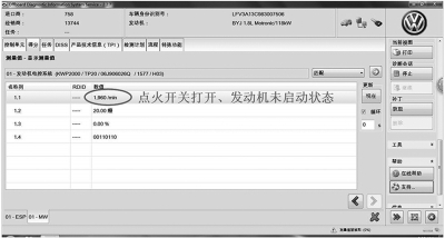 3.在试车时发现仪表的发动机转速表有时波动,检查发动机控制单元中转速数据流(点火开关打开、发动机未启动状态)发现发动机转速有时达到1900转(图10)。