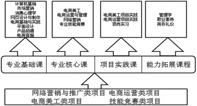 在电子商务专业课程体系设计中,以四大网上创业项目为支撑,以培养学生的网络营销与推广、电商运营与管理、电商美工、团队合作与管理能力等八大核心能力为重点,构建涵盖核心课程、专业基础课程、项目实践课程、能力拓展课程的电子商务专业课程体系,详细情况见图1。
