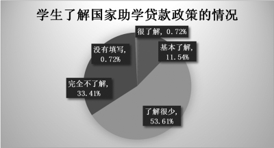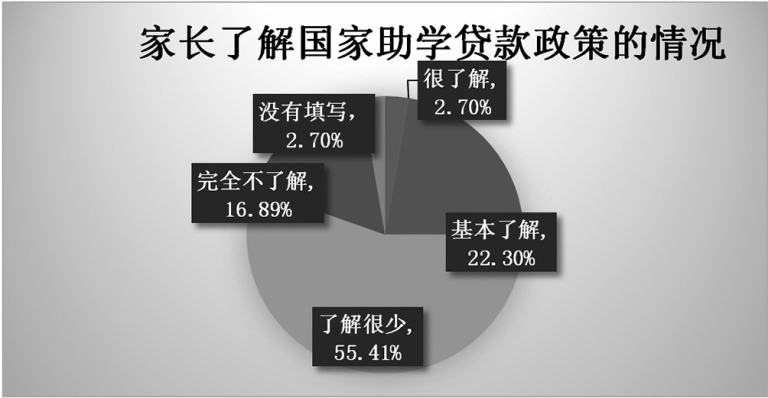 在了解国家助学贷款政策这一情况上,对其表示“很了解”的家长只占2.70%,基本了解和完全不了解分别为22.30%和16.89%,而了解很少却达到55.41%(见图2)。从中所得出的数据直接反映出家长对于国家助学贷款政策的了解情况,结合访谈发现,绝大部分接受调查的家长、学生都出现同一个问题,即对国家助学贷款的概念理解非常模糊,其中包括贷款的申请方式、贷款的金额、贷款的手续及相关证明材料、还款时期等与国家助学贷款政策相关的事宜。从根本上表明政府或相关部门对国家助学贷款政策宣传力度的欠缺。