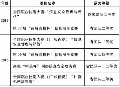 经过近年对多层次竞赛型教学模式的不断探索和研究,教学改革和技能竞赛都取得了良好效果。用人企业反馈信息表明,学生适应岗位能力较之前几届毕业生大大增强,学生在企业的留用率逐年提高,学生的就业竞争力显著提升。同时,通过教学改革,网络技术专业学生在各类竞赛中获奖数量和层次越来越高,部分获奖信息如表1所示。