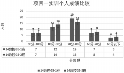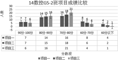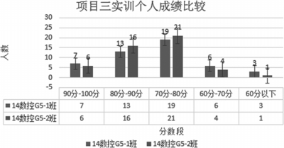 图1和图2分别为14数控编程G5-1班和14数控编程G5-2班实训项目一和实训项目三班级间个人成绩分段比较柱状图,图3为14数控编程G5-2班级内实训项目个人成绩分断比较柱状图。