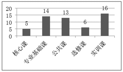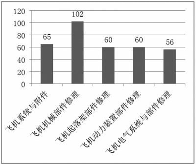 飞机部件修理专业课程类型柱状图如图1。从中可看出专业基础课程开设的数量较多,这样可以使学生在学习专业课之前打下良好的专业基础,便于更好地掌握飞机维修专业知识,从而能够胜任工作后遇到的复杂飞机维修工作。