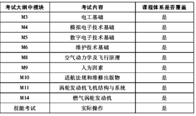 课程体系建设基于行业标准——《民用航空器维修人员执照基础部分考试大纲》(AC-66R1-02)(以下简称考试大纲),主要包括M1-M13共13个教学模块,具体如下[5]:M1:基本素质;M2:英语能力;M3:计算机应用;M4:电工基础;M5:模拟电子技术基础;M6:数字电子技术基础;M7:维护理论基础;M8:机械制图;M9:空气动力学基础及飞行原理;M10:人为因素与航空法规和维修出版物;M11:涡轮发动机飞机的结构与系统;M12:燃气涡轮发动机;M13:维修基本技能实践。课程体系中的教学内容覆盖考试大纲中的全部考核内容。学生通过这些模块的训练,应具备对民航常用机型的部件系统进行航线维护和定检,以及对飞机部件系统及机械组件进行测试和维修的核心能力,并能运用所学知识分析和排除飞机部件故障。