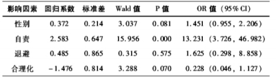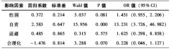 以单因素分析中有统计学意义的变量性别(男=0,女=1)、自责、幻想、退避、合理化为因变量,以心理健康筛查结果(阴性组=0,阳性组=1)为自变量,拟合二元Logistic回归方程。结果发现,自责显著影响心理健康程度(OR=13.231),随着自责程度的加重,个体发生心理问题的可能性显著上升。