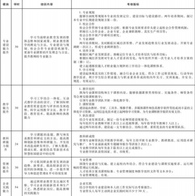 专业带头人参加省教研室统一安排的项目模块培训,按计划每完成一个模块培训,需参加相应培训模块的考核或编制专业建设特定项目改革方案(或实施方案)。