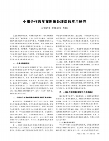 小组合作学习是在班级授课制背景下的一种教学方式,即在承认课堂教学为基本教学组织形式的前提下,教师以学生学习小组为重要的推动性,通过指导小组成员展开合作,发挥群体的积极功能,提高个体的学习动力和能力,达到完成特定的教学任务的目的,改变了教师垄断整体课堂的信息源而学生处于被动地位的局面,从而激发了学生的主动性、创造性。小组合作学习有利于:(1)培养学生的社会适应性;(2)培养学生的沟通能力;(3)培养学生的学习能力和学习积极性。每个班级总会有在图像处理课上学得特别快的同学,通过分组,将这些同学分到不同的组中,充当“小老师”的角色,能较快地完成学习任务。