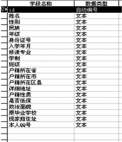 (2)在website文件夹下新建名为xsxx.mdb(学生信息)的access数据表,包含字段如下:姓名、性别、民族、年级、身份证号、入学年月、修读专业、学制、班级、户籍所在省、户籍所在市、户籍所在区县、详细地址、户籍性质、是否低保、政治面貌、原毕业学校、现在家庭住址、本人QQ号,制作完成后的ACCESS表效果见图1。