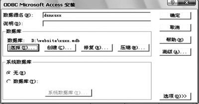 开始——设置——控制面板——管理工具——数据源 (ODBC) ——系统DSN——添加按钮——选择Microsoft Access Driver (*.mdb) ——完成——数据源名称为dsn+数据表的名称(本实例中为dsnxsxx)——数据库——选择表的路径。最后确定,如图2。