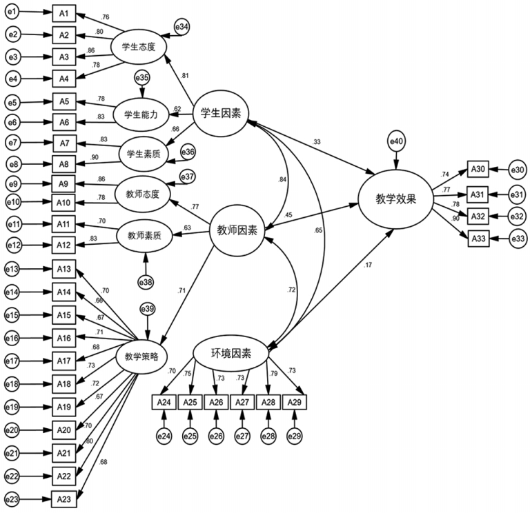假设一:“学生因素”“教师因素”“环境因素”都对“教学效果”具有正向影响关系;