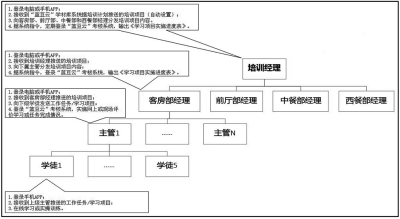 按照教学计划,结合学生的岗位实践内容,在Landow云网络平台上,酒店培训经理发布学习任务,并通过部门经理、主管在平台上逐级布置到现代学徒制班学生,学生登录Landow系统完成学习和自动考核,主管网上进行检查和评估。