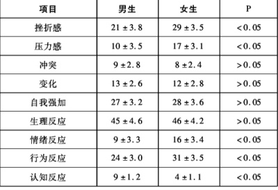 由表4可见:从性别上进行比较,男生与女生在冲突、变化、自我强加、生理反应等方面与女学生评分差异无显著性,但在挫折感、压力感、情绪反应、行为反应及认知反应等方面,差异较显著,女生在挫折感、压力感、情绪反应、行为反应等方面的评分明显高于男生。