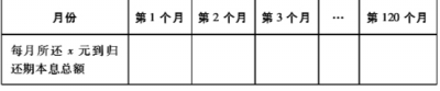 (4)填表:等额本息还款方式:(银行从每月月供款中,先收剩余本金利息,后收本金;利息在月供款中的比例中随剩余本金的减少而降低,本金在月供款中的比例因而升高,但月供总额保持不变。假设月供额为x元)。注:实际上,每月所还x元到归还期本息总额构成一个等比数列。