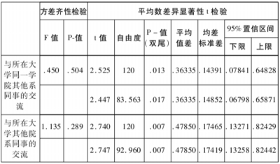 那么,和没有参加跨学科组织的教师相比,加入跨学科组织的教师对跨学科交往在学术创新中的作用是否持更加认可的态度?笔者以“与所在大学同一学院其他同事的交流”、“与所在大学其他院系同事的交流”两种学术交往类型上在“加入跨学科组织”和“没有加入跨学科组织”两组教师上分别进行了两个独立样本平均数差异的t检验,见表5。统计结果在0.05水平上差异显著。这说明,和没有加入跨学科组织的教师相比,跨学科交往(“与所在大学同一学院其他同事的交流”和“与所在大学其他院系同事间的交流”)在参加跨学科组织教师科研“想法”产生中发挥作用较大。他们对这两种学术交往类型“发挥作用大”持更加认可的态度。