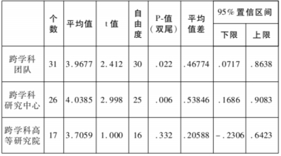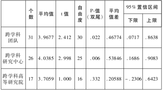 这是否意味着高校教师跨学科交往在高校教师学术创新中不重要?或者是它确实重要,只是还没有发挥出它应有的效用?本研究把跨学科团队、跨学科研究中心和跨学科高等研究院作为跨学科组织的三种主要类型。取值“3.5”(3代表“较小”,4代表“较大”,3.5是中间值),对这三类跨学科组织对促进高校教师跨学科交往发挥作用大小进行单样本t检验,见表4。跨学科团队P值为0.022,小于0.05,差异显著;跨学科研究中心P值为0.006,小于0.05,差异显著;跨学科研究院P值为0.332,大于0.05,差异不显著。说明跨学科团队和跨学科研究中心在促进不同学科高校教师交往上作用显著,跨学科研究院发挥作用较小。这说明跨学科组织为高校教师跨学科交往提供的组织、制度上的支持确实发挥了作用,且作用相对来说较显著,这也说明在以上两种跨学科组织中不同学科教师之间确实进行了富有成效的交往。