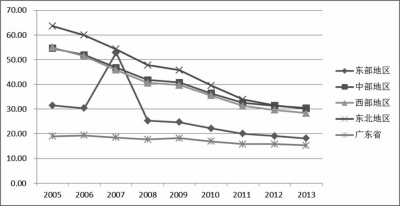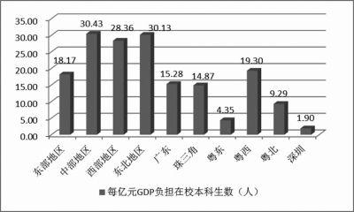 从各区域及深圳市层面看,2013年每亿元GDP负担在校本科生数,只有粤西超过全省总体水平,但仍低于我国中、西部及东北地区;珠三角略低于全省总体水平,但深圳市仅为1.90人;粤东、北地区都在10人以下,粤东地区还不到5人,与我国东、中、西部及东北地区有较大差距。这表明,珠三角和粤东、西、北地区的在校本科生规模与经济规模发展有较大的不适应性;经济发达的珠三角在校本科生规模还有较大的提升空间;粤西可适当放缓在校本科生规模的发展;粤东、北地区在校本科生规模仍需着力提升;深圳市应大力扩大在校本科生规模(见图6)。