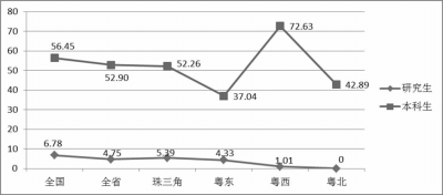 在人才需求方面,高新技术产业和战略性新兴产业发展将对具有交叉知识的科技研发人才的需求逐步增加,先进制造业、现代服务业和传统优势产业对具有一线工作技能、服务意识和服务能力强的应用型人才的需求将逐步增加。可见,未来广东既需要更多数量的研究型大学,也需要大量的应用型本科学校。然而,广东省本科学校不仅占全省高等学校比例低于全国,而且“985工程”、“211工程”等高水平大学占本科学校的比重也低于全国平均水平,差距均接近4个百分点,这两方面与北京、上海、江苏、陕西、湖北等高等教育发达省份相比更是差距甚远。由此,也导致广东省本科尤其是高层次人才培养规模偏低。从2013~2014学年在校研究生、本科生占在校生(指高等学校全日制在校生,下同)比例看,除了粤西在校本科生占在校生比例高于全国平均水平外,广东省及其各区域整体上均低于全国平均水平,不但与当前广东省经济地位不相适应,更使得未来产业转型升级后继乏力(见图7)。例如深圳市目前仅有3所本科学校,其中包括了近三年新建的南方科技大学和香港中文大学(深圳),为此全市每年要从外地引进约4万名大学毕业生,其中市外院校理工类毕业生约占深圳市接受理工类毕业生总数的90%。