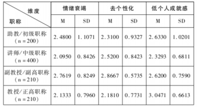 由表6所见,副教授在三个维度上的数据都相对较高。究其原因,可能是因为副教授职称的教师大多都是高校教学、科研的中坚力量,他们不仅承担着繁重的教学和学生管理的任务,还承担着艰巨的科研任务,有的可能还有行政职务,并且还想着上升为教授职称,工作负荷重,因此更容易产生职业倦怠。在低个人成就感方面,教授最为严重,可能是因为评上教授职称后心理落差大的缘故。