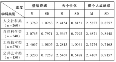 如表7所示,河南省高校教师中,情绪衰竭维度最严重的是工程技术类教师,去个性化和低个人成就感维度最严重的是自然科学类教师,这是因为自然科学类和工程技术类的教学和科研相对于人文社科类和公共艺术类来说,比较枯燥乏味。而人文社科类和公共艺术类教师的职业倦怠的绝对值也不低,应该是与河南省高校的政策倾斜有关,学校对人文社科类和公共艺术类的支持力度可能不够。此外,人文社科类和公共艺术类的科研创新也是有很大困难,这方面也给了他们很大的压力。