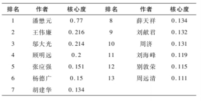 核心—边缘结构分析是根据网络中节点之间联系的紧密程度,将网络中的节点分为两个区域,核心区域和边缘区域。处于核心区域的节点在网络中占有比较重要的地位。核心—边缘结构分析的目的是研究社会网络中哪些节点处于核心地位,哪些节点处于边缘地位, 其本质是将实际数据与理想的模型数据进行比较,通过计算两者的相关性来分析实际数据是否具有核心—边缘结构。[15]通过在 Ucinet 软件中对学者共被引网络进行连续性核心—边缘模型分析,计算结果显示实际数据与理想模型之间的相关系数为 0.859,属强相关,说明作者共被引网络存在核心—边缘结构。软件同时也计算出了每位学者在网络中的核心度,我们以核心度大于0.1为标准,共筛选出13位核心学者,如表7所示。排名第一的是潘懋元教授,其核心度达到0.77,远远大于其他的学者。对比表6可以发现,这13位学者均属于度数中心性居前15位的学者范围,可见,核心度排名跟度数中心性排名也是基本一致的,都可以在一定程度上表明学者在网络中的地位和位置,确定谁是核心学者。
