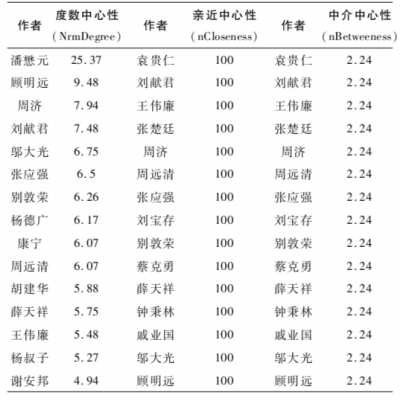 亲近中心性又叫接近中心性,是以距离为概念来计算一个节点的中心程度,与别人越近则中心性越高,与别人越远,则中心性越低。[13]在社会网络中,亲近中心性主要是指某点到网络中所有其他点的距离总和最短。这样的点在网络中有最佳的视野,可以知道网络中所发生的事情,以及信息的流通方向,该点在传递信息方面就越容易。由表6可知,亲近中心性居前的10位学者,他们的亲近中心性都是100,说明他们具有一致且最高的亲近中心性,具有最佳的学术视野,掌握着学术信息流通方向。