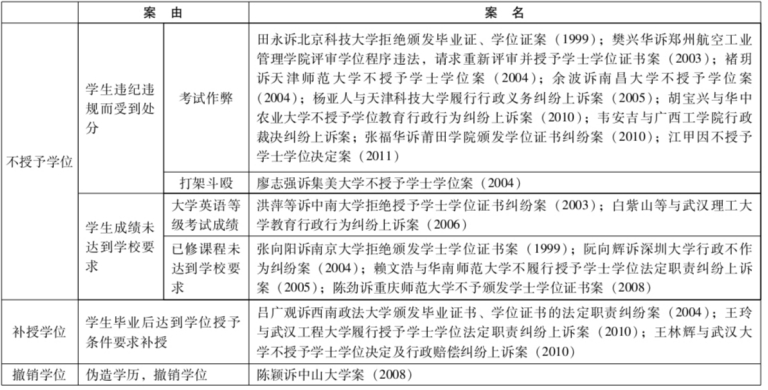 自1999年第一例学位诉讼案发生以来,越来越多的人将学位纠纷诉诸于法律。这些纠纷集中于不授予学位、补授学位和撤销学位三类(见表1)。从表面上看,这些是学生与学校之间的纠纷,但实际上,我们需要拷问学校作为被告是否适格?
