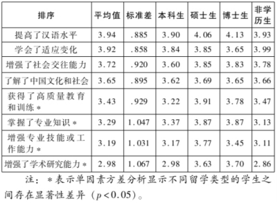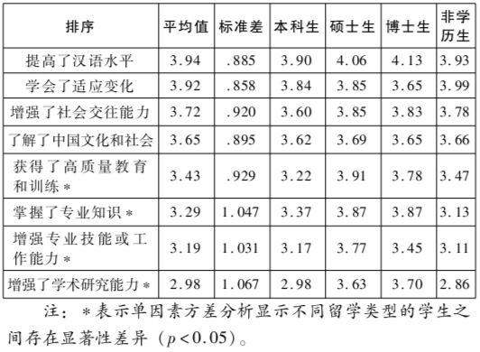 进一步分析还可以发现,在“获得高质量的教育和训练”(F=6.301, p=.000)、“掌握专业知识”(F=11.738, p=.000)、“增强了专业技能或工作能力”(F=9.988, p=.000)以及“增强了学术能力”(F=11.285, p=.000)方面,本科留学生和非学历留学生都认为其所收获的教育成就要明显低于硕博外国留学生所感受到的教育成就。
