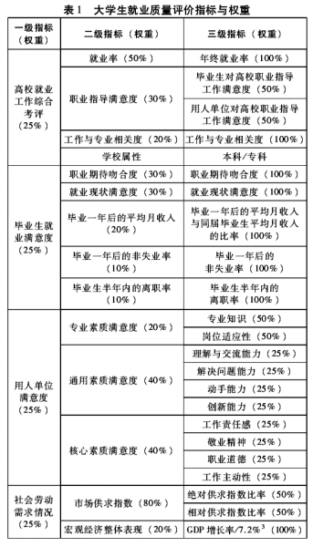 1.高校就业工作综合考评。全校2011届毕业生年终就业率为96.04%,其中就业率最高的三个学院分别是动物科学学院(99.46%)、林学院(99.14%)、水利与土木工程学院(99.09%),最低的学院是理学院(91.7%)。职业指导工作满意度的评价主体包括毕业生和用人单位两方面,毕业生满意度最高的是信息学院(97%),最低的是水利与土木工程学院(87%);用人单位对学校职业指导工作的满意度为89.4%。由于大部分用人单位在全校招收多个学院的学生,其评价针对学校非学院,因此本次举例忽略用人单位对高校职业指导工作满意度的数据。该届毕业生工作与专业的相关度为62%,工作与专业相关度最高的学院是水利与土木工程学院(92%),工作与专业相关度最低的学院是农学院(40%)。“学校属性”以广东省为例,目前共有本科院校58所,专科院校80所,本专科学校在进行就业质量评价时应予以区分。由于本次举例为同一学校不同学院的评价,因此该项予以忽略。