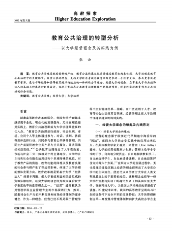 摘要:教育公共治理是制度创新的产物,教育公益的最大化需要通过教育机构来体现,大学治理是教育公共治理中的关键环节。经营大学的理念,是指大学将自身视为教育市场竞争的一个经营主体,参与竞争优质教育资源,是与市场经济和高等教育规律相适应的一种新的办学理念。经营大学的理念,在尊重大学作为经济法人的基础上对其进行制度设计,体现了市场在公共教育治理转换中的推动作用,将最终实现教育作为公共领域的社会功能。
