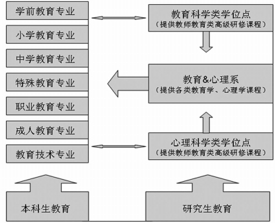 2.由单一的职前培养转变为职前培养和职后培训双重职责。与此功能相适应,应由过去“老三门”的教育学、心理学、学科教学论的课程结构,转变为根据不同教育层次的教学科目及教育实践需要设置课程的课程结构。如我国幼儿园主要开设识字、画画、游戏等教学科目,学前教育专业则开设舞蹈、绘画、声乐、玩具制作等课程;小学主要开设语文、数学、英语、科学、社会、美术、音乐、体育等教学科目,小学教育专业则开设小学语文教育、小学数学教育、小学英语教育、小学科学教育、