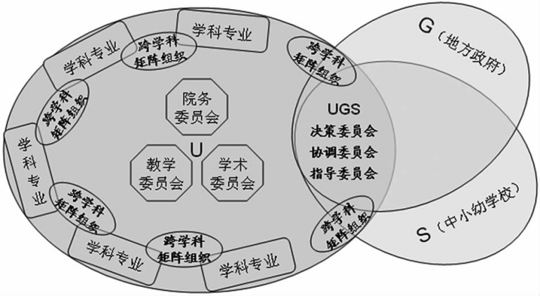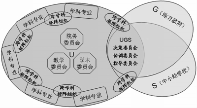 3.由以大学为本的学术型教师教育转向大学与中小学伙伴合作的临床型教师教育。与此功能相适应,应由过去院长-副院长-教学科研办公室-各系-各专业-各教研科研小组的线性科层制管理结构,转变为立体开放的扁平状管理结构(如图2所示)。它与大学教育学院传统管理构架最显著的区别是:结构性地增加了一套横跨大学(U)、地方教育行政部门(G)、中小幼学校(S)之间的管理体系。以美国大学教育学院与中小幼学校的PDS(Professional Development Shools)伙伴合作模式为例,其管理构架一般包括作为日常工作机构的“PDS指导委员会”(PDS Steering Committee),基于大学的“大学决策委员会”(the Campus Based Decision-Making Council),基于合作联盟的“PDS协调委员会”(PDS Coordinating Council)。PDS指导委员会定期向大学决策委员会和PDS协调委员会报告工作。[2]U-G-S之间一般有三种典型的治理结构:联络员制、单一学校为主的指导委员会制、校际协调委员会制。[3]大学教育学院的纵向管理结构也发生变化,在院级管理机构统筹下,与上述U-G-S横向管理体系相协调,各系各专业及活跃其中的多种跨学科跨专业的矩阵组织,快速灵活地对中小学和幼儿园多重、多样的教师教育需求作出反应;教学委员会、学术委员会、院务委员会等各种委员会则根据反馈就教师教育课程、教育科学研究方向、学院重要发展事务等提出咨询意见;学院统筹对教学、科研等办学行为作出调整,始终保持和基础教育需求的动态平衡。