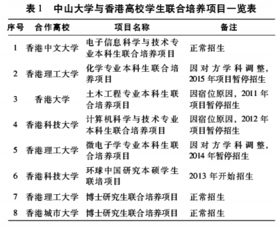 经过30多年的发展,粤港教育合作成果丰硕。香港高校与广东高校的人员交流更加频繁,合作形式更加多样。以中山大学为例,中山大学先行先试,积极拓展与香港高校的办学合作,开展了全方位多层次的联合培养项目。从2005年起,中山大学先后与香港大学、香港中文大学、香港科技大学、香港理工大学签署协议,分别开展本科生和研究生层次的联合培养项目(如表1)。香港高校不仅在广东直接招收学生,而且还采用灵活的机制直接与广东高校联合办学,比如珠海的北京师范大学-香港浸会大学联合国际学院(UIC),以及目前获批的由香港中文大学、深圳巿人民政府和深圳大学共同建立香港中文大学(深圳)。这些实质性的交流与合作有效推动了粤港高校的发展,积极促进和提高两地人才培养。