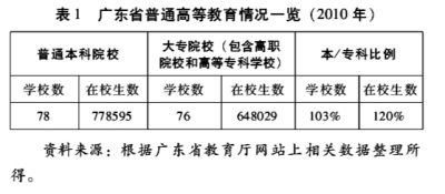 社会对人才的需求大体分为理论学术型人才(从事科学研究)和技术应用型人才两大类。[2]理论学术型人才主要由研究性大学提供,技术应用型人才则主要由应用型本科院校和高等职业院校提供。国际教育分类标准也将高等教育分为5A和5B两大系列。5A为理论学术型,5B为实用技术型。随着社会经济的不断发展,社会对5B型教育的需求越来越大,产业升级换代不仅需要具有娴熟的操作技能,还应该具备深厚的理论知识,善于把理论和实际操作结合起来,以便解决实践中遇到的复杂技术问题。显然,这一需求仅仅由高等职业教育来提供是远远不够的。因此,许多发达国家和地区在适应产业升级的过程中建立起了完备的应用型人才培养体系。例如,德国上世纪60年代开始设置兼具普通大学和高等专业学校特色的应用科技大学,以培养本科层次应用型人才;我国台湾地区70年代将许多专科学校改制为技术学院,后来部分技术学院升格为科技大学,从而形成从中专、大专、本科至研究生层次的完整的应用型人才培养体系;日本、英国、法国也经历了类似的过程。[3]在我国,由于传统教育根深蒂固的影响,本科教育一直被归为5A的类型,重视学术理论知识的传授,并且一直作为高于5B的一种培养层次来对待。事实上,5A和5B只是高等教育的两种类型,它们之间不应该有层次之分。这导致了我国本科教育培养出来的学生,其解决实际问题的能力不足,无法满足产业升级的需求。据统计,广东省有普通本科院校78所,其中23所具有培养研究生的资格,本科在校生数778595人;大专院校76所,在校生数648029人(见表1)。可以看出,无论是学校数,还是在校生数,本科教育阶段的规模均大于专科规模,即广东省高等教育仍然是一个以学术型教育为主的教育体系。由于大规模本科教育的发展定位模糊,对学生的应用能力、操作能力、解决问题的能力培养不足,尚不能满足产业转型升级的需要,无法有效为广东产业升级服务。因此,广东高等教育亟需由以学术型教育为主向以技术应用型教育为主转型。