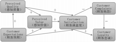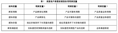 其中顾客预期(Customer Expectations)、感知质量(Perceived Quality)、感知价值(Perceived Value)是自变量,顾客满意度(Customer Satisfaction)是因变量,顾客抱怨(Customer Complaints)和顾客忠诚度(Customer Loyalty)是满意度的结果变量。ACSI中前半部的4个变量结构是主模型,也是本研究的重点,各结构变量的观测变量如表1所示。[12]