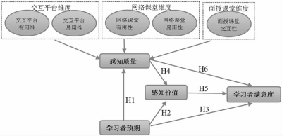 本研究继承了ACSI模型的一些核心概念和架构。考虑到翻转课堂教学不是普通的商品,而是一种教育服务,其质量的含义不能用普通商品的质量概念来定义。FCM包括网络课堂、交互平台、基于问题解决学习(PBL)的面授三个板块,对于整个FCM的质量评价体系需要全面地囊括这三个方面,同时学习者对信息技术的使用依赖较多。鉴于以上考虑,假设模型将TAM的核心变量整合到感知质量中(如图4所示)。