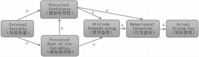 技术接受模型(Technology Acceptance Model)是Davis F D,Bagzzi R P等人对信息技术的认知或接受程度的研究。该模型包括外部变量(External Variables)、感知有用性(Perceived Usefulness)、感知易用性(Perceived Ease of Use)、使用态度(Attitude Towards using)、行为意向(Behavioural Intention)5个自变量和实际使用(Actual System Use)1个因变量(如图2所示)。[13]