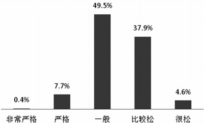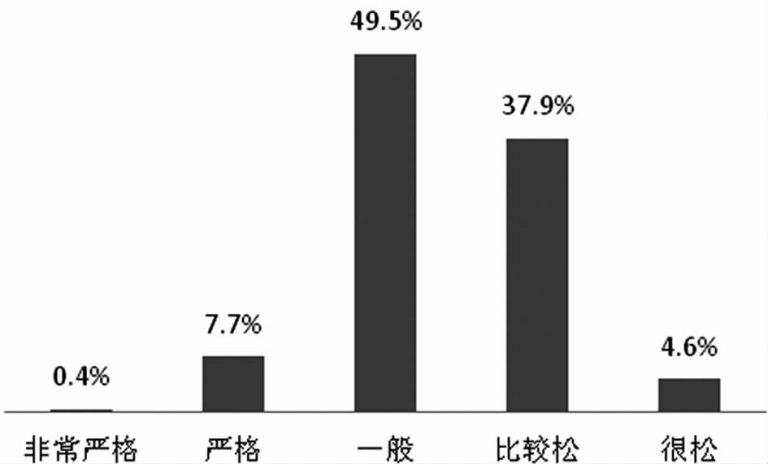 从教师的视角来看,通识课程教学中对学生的要求适中——“我对学生课程学习的要求比较严”这一题项的平均得分为3.62(SD=0.677,满分为5分)。在前面对学生学习现状的调查研究中,普遍反映出教师对学生的要求不是很严格(见图4)。访谈中也有学生表达出同样的观点:“**老师是个很可爱的老师,课上带活课堂气氛,整个人很和蔼,对我们要求不是很严格”;“我们现在上的通识课要求都太低”;“有很多同学为了学分,报了这门课,但他又不认真上课,这个要加以监督”。但现实中很多同学对于教师的要求抱着一种比较矛盾的心理:既感觉到了教师对课程的要求不严会导致课程质量的不断下滑,但又不期望教师对课程的要求太严格,不期望在通识课程方面有太多的投入。