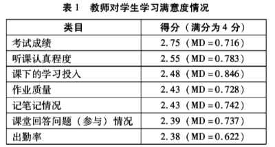 从表1可以看出,教师对学生考试成绩的满意度最高,对学生上课的出勤率和课堂参与情况的满意度比较低。