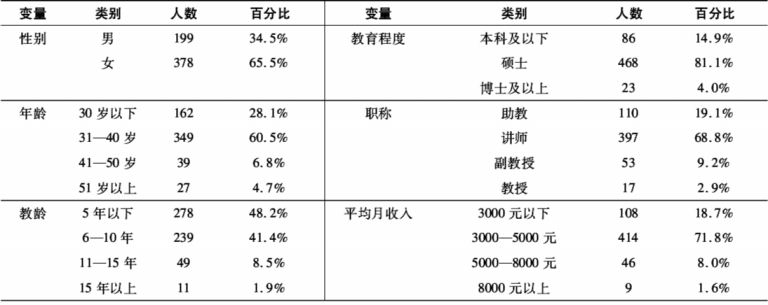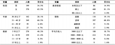 本研究选取了北京、天津、山东、河南、浙江、海南6个地区的7所民办高校教师为调查对象,发放问卷800份,经过废卷处理,将空白过多、反应倾向过于明显的问卷剔除,最后得到有效问卷577份。样本的人口特征分布如表1所示。