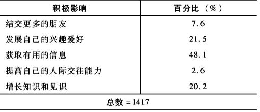 大学生参加网络组织具有多方面的积极影响。从表6可以看出,广州地区大学生参加网络组织最大的积极影响就是“获取了有用的信息”,占被调查总体的48.1%。“发展了自己的兴趣和爱好”以及“增长了知识和见识”也被认为是参加网络组织的重要的积极影响,分别占被调查总体的21.5%和20.2%。而“结交了更多朋友”和“提高了个人人际交往能力”的积极影响则并不明显,两者的选择比例都比较低。