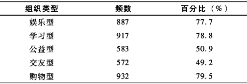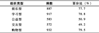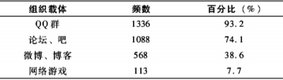 从表3可以看出,广州地区大学生参加网络组织的载体主要是QQ群和论坛,有93.2%的受访者拥有QQ群或MSN,是选择比例最高的网络组织载体。其次是各类论坛和吧,如各高校的BBS和贴吧,有74.1%的受访者选择此类网络组织载体。微博和博客作为一种近几年才出现的新的网络组织载体,有38.6%的受访者表示拥有自己的微博或博客。
