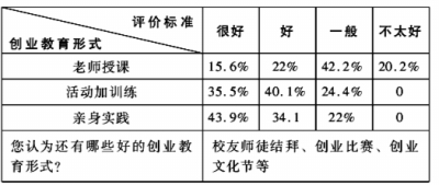 在对创业教育指导方式的调查中,亲身实践是最受欢迎的方式,其次是活动加训练,最后是老师授课(具体结果见表5)。这说明传统的教学模式重理论轻技能,已经满足不了学生将来创业的需要,而实践性强的方式更容易被学生接纳。另外,在与学生的访谈中得知,有很大一部分学生赞同开展校友师徒结拜、创业比赛、创业文化节等活动,以行之有效的教育方式指导创业实践。