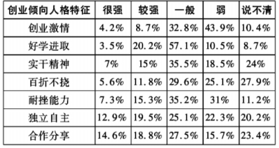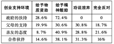 实施自主创业须具备很多条件,其中如“支持环境”等客观因素将起着重要的作用。外贸英语专业学生对当前创业的外部环境普遍评价不高,相信政府、父母、亲友及合作伙伴给予物质资助的,分别占28.6%、19.9%、8.7%、14.6%,而相信给予精神上的鼓励比例却高得多。还有将近半数的学生认为他们的父母、亲友和合作伙伴劝说他们放弃创业或完全反对他们自主创业(具体见表3)。看来,虽有部分学生有创业的设想和计划,但感觉难以得到外部环境的支持。在与学生的访谈中得知,资金问题依旧是大学生创业的软肋,他们希望政府能够营造一个宽松的创业环境,让大学生创业可以享受到更多的扶持措施。