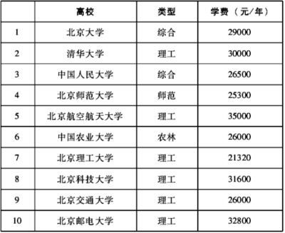 本文调查了北京地区排名前10的“211”高校培养全日制国际研究生收取的学费。由于各高校在培养留学生时的专业和项目设置有差异,高校不同专业、不同项目学费差异较大,由于不同的理科专业涉及的实验设备、材料成本等不同,而文科专业不涉及这类成本,所以为了剔除教育成本的影响,本文仅考虑培养一名普通文科类国际硕士研究生的学费,总结出北京地区部分高校文科类留学生学费表,如表1。