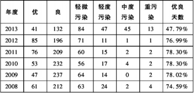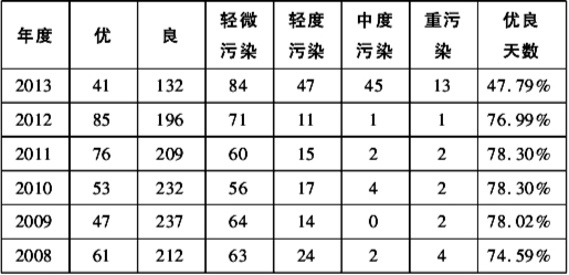 1.环境问题。环境问题日益突出,环境质量也成为了影响留学生选择学校的因素之一。以北京为例,我们研究总结了自2008年以来北京的空气质量,如表2。