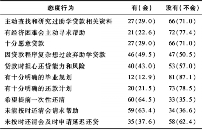 超过70%的贷款学生没有做过或者不会采取“主动查找和研究过助学贷款相关资料”“有经济困难会主动寻求帮助”“十分愿意贷款”“有十分明确的毕业规划”“有十分明确的还款计划”的行为做法;而有“因贷款程序复杂想过放弃助学贷款”“贷款时担心还贷能力和风险”行为或态度的贷款学生比例与没有该行为和态度的基本持平;选择“希望提前一次性还清”“未能按时还清会请求帮助”的贷款学生比例高于不选择该行为的学生比例;选择“未按时还清会及时申请延迟还贷”的贷款学生比例低于不选择该行为的学生比例。