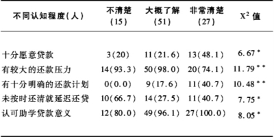 经卡方检验X2分别为26.7%和31.3%,说明贷款学生对于助学贷款政策的认知不受个人专业的影响,在目前相同宣传方式和贷款形式影响下的贷款学生认知水平相当。