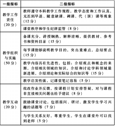 学生评教制度的设计依赖于评教指标及其体系,课堂教学质量评定指标应该具有客观、全面以及便于理解等特点。首先,应该建立在课堂教学客观规律基础上,体现学科教学的特点,体现教学的统一,减小主观因素对评价结果的影响;其次,结构上能够体现课堂教学的整体性,并力求做到评价项目、内容具体明确。因此,评价教学质量的指标体系通常包括三个方面,即教学内容、教学方法和教学效果。[13][14]